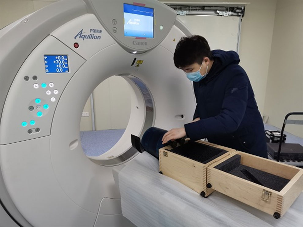 當前疫情防控仍處在吃勁的關鍵階段,醫護人員還在前線同病毒抗爭。在醫院各個科室,除了有醫護人員的忙碌,還有許多計量人的身影。日前,揚州市寶應縣第二人民醫院聯系江蘇省計量院,用于新冠肺炎篩查診斷工作的CT機急需現場檢測。2月25日上午,江蘇省計量院醫學所兩名檢定員走進醫院科室開始了計量檢測。